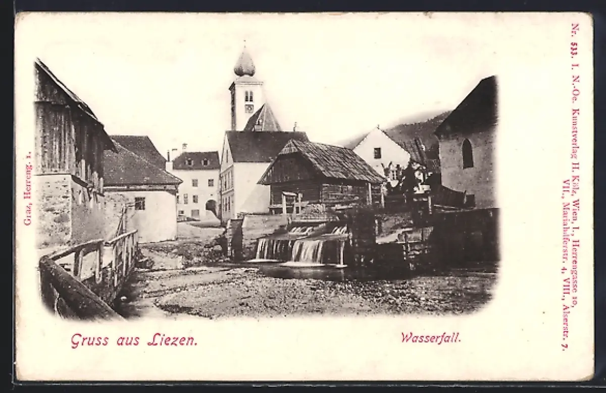 AK Liezen, Wasserfall, Im Hintergrund Kirche