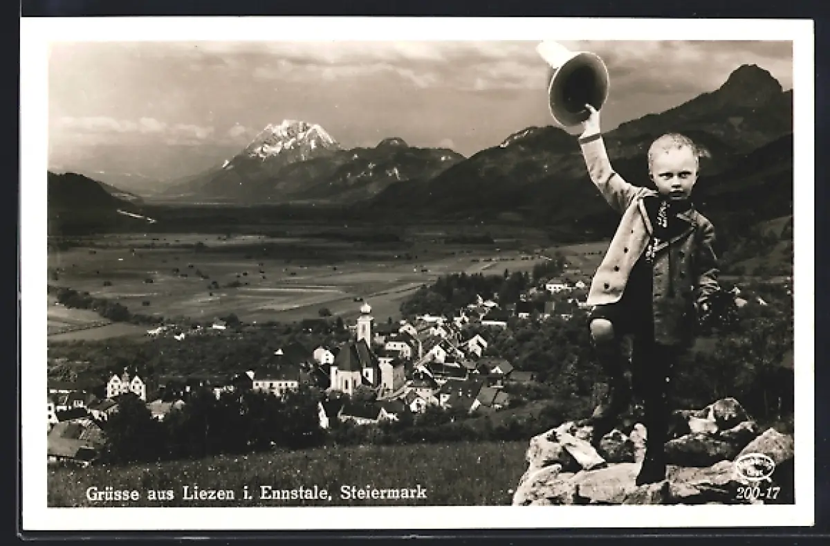 AK Liezen i. Ennstale, Ortspanorama mit Kirche, Kleiner Junge in Tracht