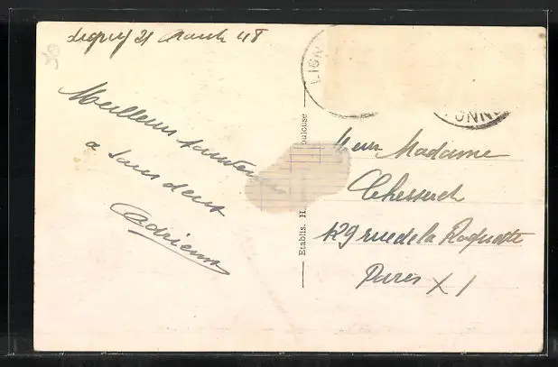 gelaufen 1948, Briefmarke entfernt, rückseitig Klebe- und Papierreste, Eckknick li. oben, Stempelspur, sonst guter Zustand