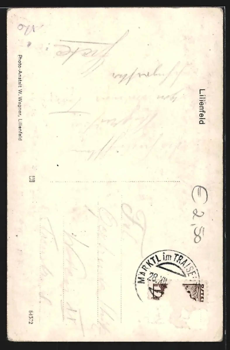 Personenbezogene Daten auf der Rückseite der Karte wurden durch blauen Textmarker unkenntlich gemacht. Die blauen Stellen sind auf die Vorderseite durchgeweicht und wirken sich negativ auf das Postkartenfoto aus