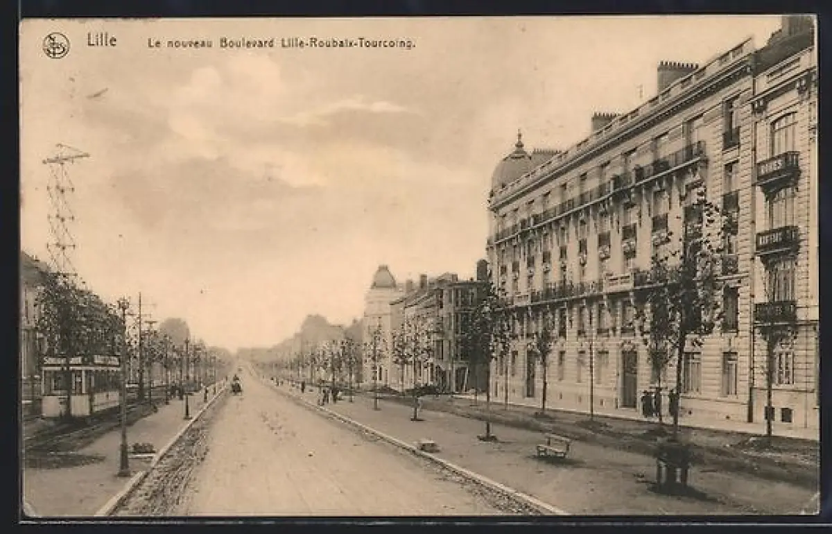 AK Lille, Nouveau Boulevard Lille-Roubaix-Tourcoing, Strassenpartie mit Strassenbahn