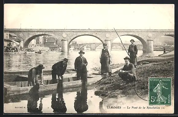 AK Limoges, Le Pont de la Révolution avec des pêcheurs au bord de la rivière
