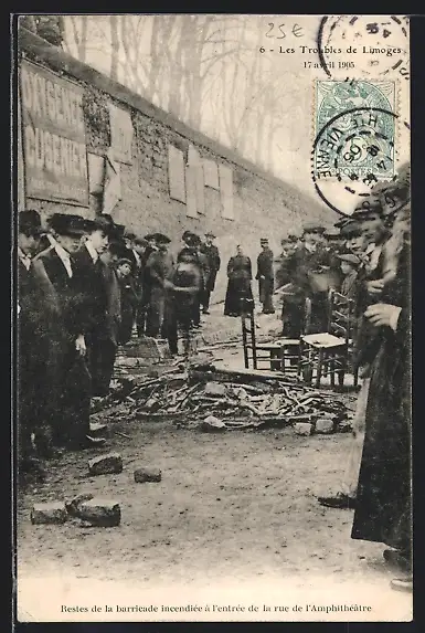 AK Limoges, Les Troubles 1905, Restes de la barricade incendiée à l`entrée de la rue de l`Amphithéatre