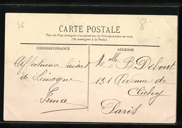 Personenbezogene Daten auf der Rückseite der Karte wurden durch blauen Textmarker unkenntlich gemacht. Die blauen Stellen sind auf die Vorderseite durchgeweicht und wirken sich negativ auf das Postkartenfoto aus