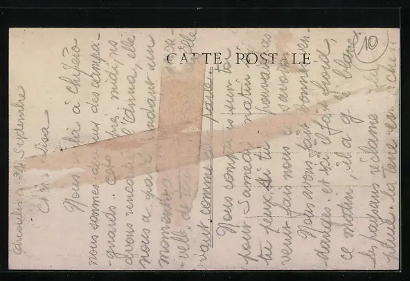 Personenbezogene Daten auf der Rückseite der Karte wurden durch blauen Textmarker unkenntlich gemacht. Die blauen Stellen sind auf die Vorderseite durchgeweicht und wirken sich negativ auf das Postkartenfoto aus