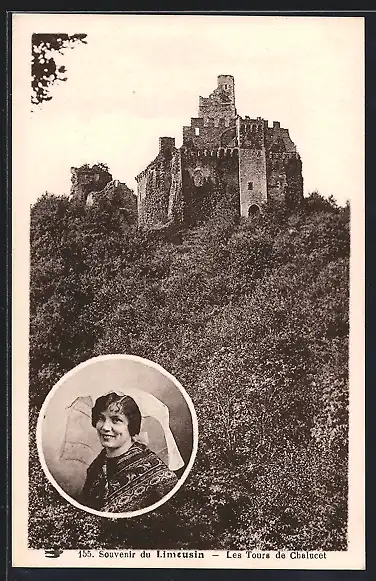 AK Limousin, Les Tours de Chalucet avec portrait d`une femme