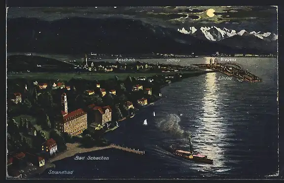 AK Lindau / Bodensee, Ortsansicht mit Bodensee u. umliegenden Orten bei Mondschein