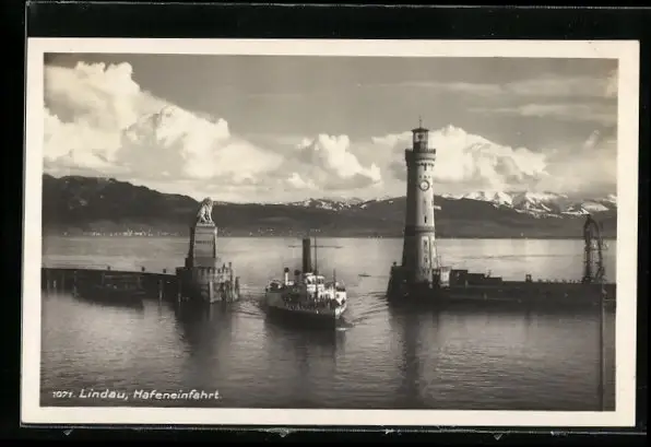 AK Lindau, Hafeneinfahrt mit Dampfer und Leuchtturm