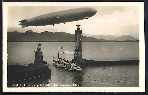 AK Lindau, Luftschiff LZ 127 Graf Zeppelin über dem Hafen, Dampfer