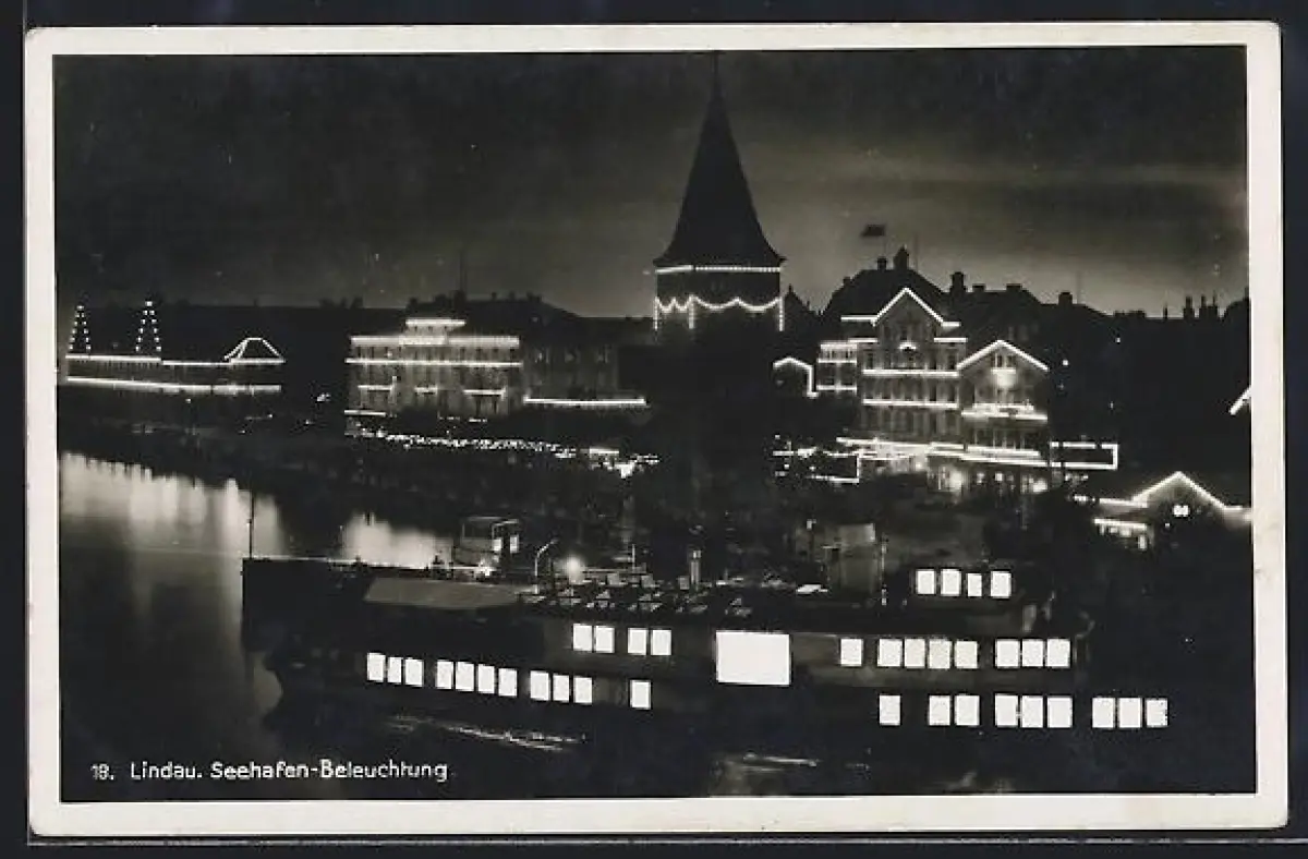 AK Lindau, Uferpartie mit Seehafen-Beleuchtung