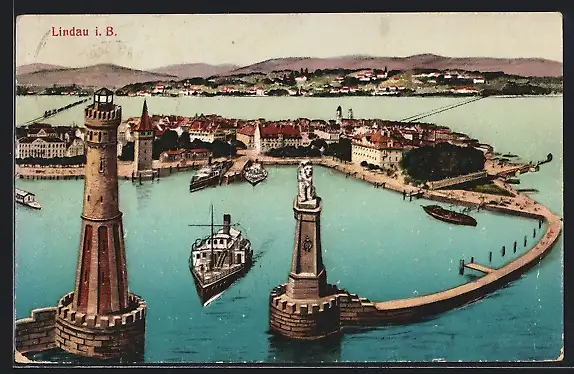 AK Lindau i. B., Hafeneinfahrt und Leuchtturm