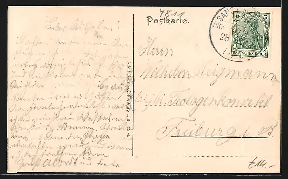 Personenbezogene Daten auf der Rückseite der Karte wurden durch blauen Textmarker unkenntlich gemacht. Die blauen Stellen sind auf die Vorderseite durchgeweicht und wirken sich negativ auf das Postkartenfoto aus