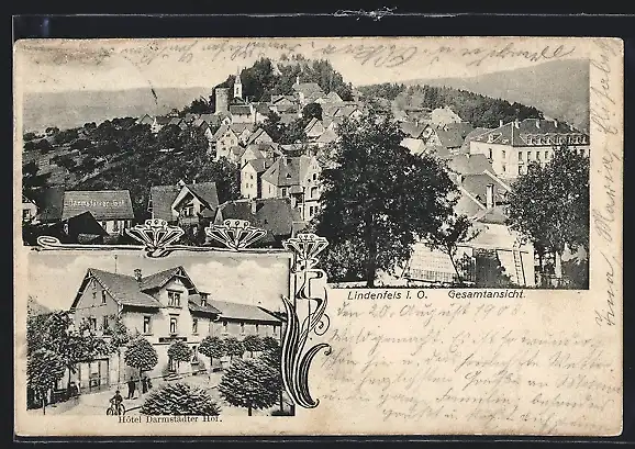 AK Lindenfels i. O., Hotel Darmstädter Hof, Teilansicht der Stadt
