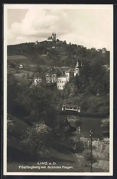 AK Linz, Bergbahn am Pöstlingberg mit Blick zum Schloss Hagen