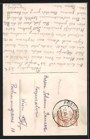 Personenbezogene Daten auf der Rückseite der Karte wurden durch blauen Textmarker unkenntlich gemacht. Die blauen Stellen sind auf die Vorderseite durchgeweicht und wirken sich negativ auf das Postkartenfoto aus