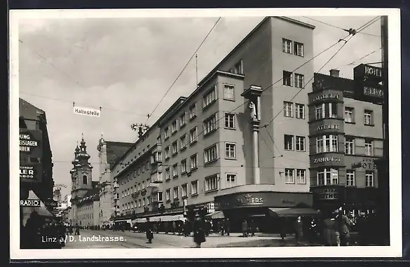 AK Linz, Landstrasse mit Geschäften und Central Apotheke