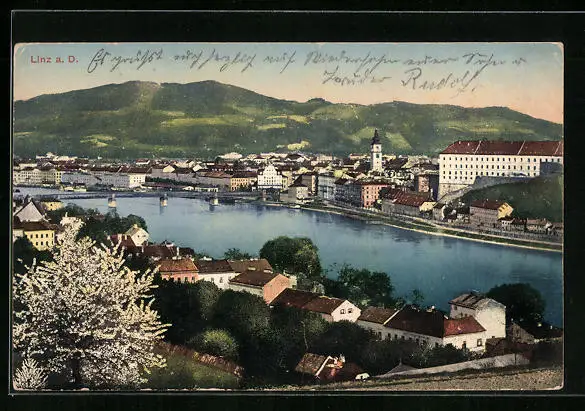 AK Linz a. D., Bebautes Ufer der Stadt mit Brücke