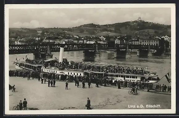 AK Linz a. D., Eilschiff in Flaggengala an der Anlegestelle