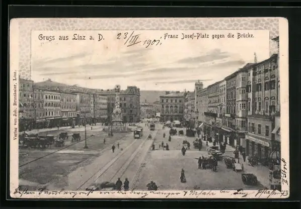 AK Linz a. D., Franz Josef-Platz gegen die Brücke, Strassenbahn