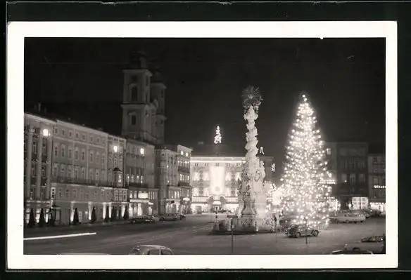 AK Linz a. D., Ortspartie mit Denkmal und Weihnachtsbaum