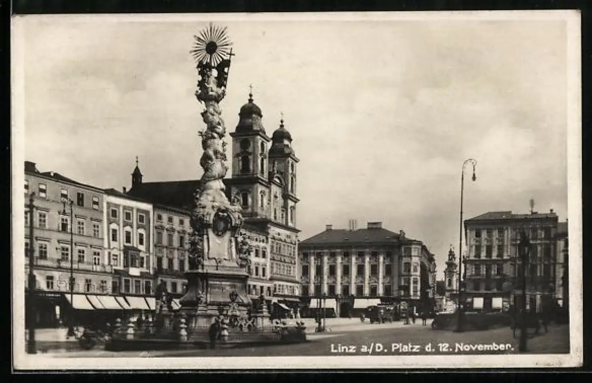 AK Linz a. D., Platz d. 12. November, Dreifaltigkeitssäule vor Stadtgebäuden