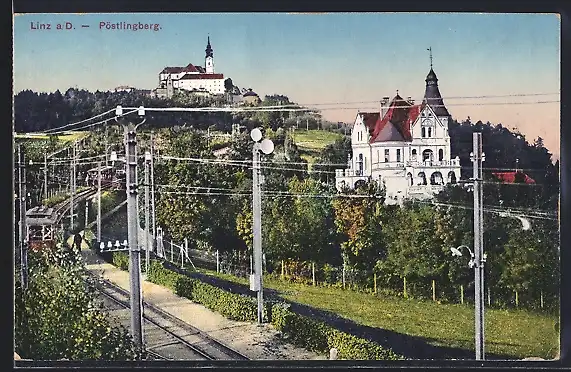 AK Linz a. D., Pöstlingberg, Ortsansicht mit Bergbahn