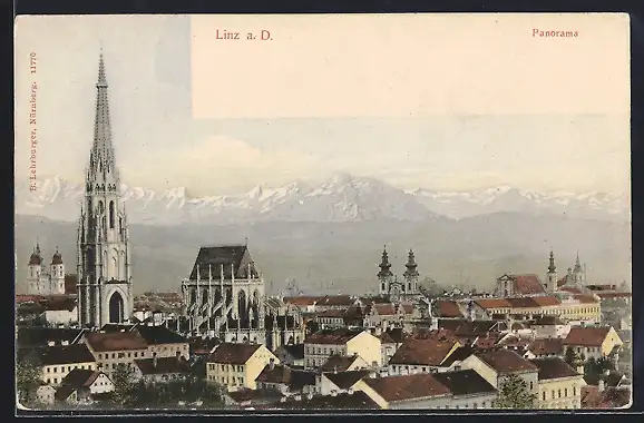 AK Linz a. D., Teilansicht mit Bergpanorama