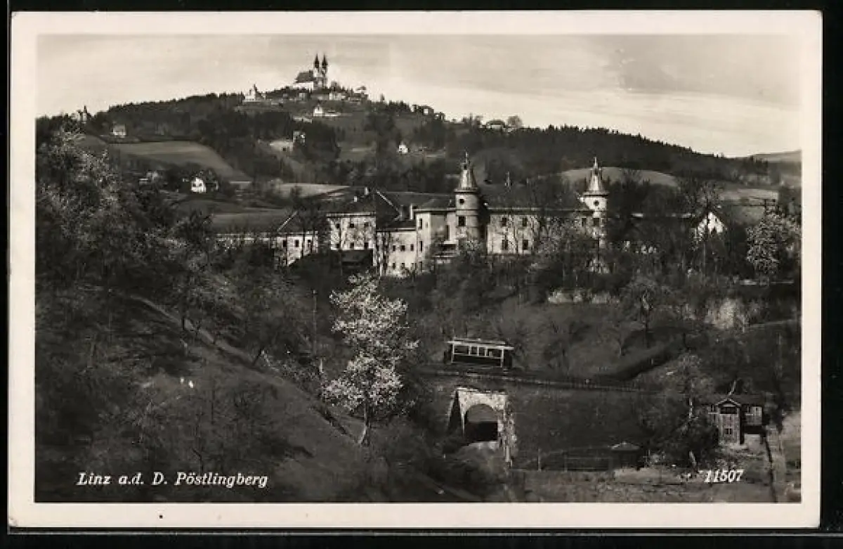 AK Linz a. d. D., Pöstlingberg mit Bergbahn aus der Vogelschau