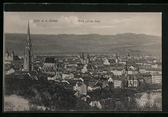 AK Linz a. d. Donau, Blick von der Gugl auf den Ort mit Kirche