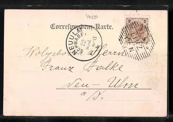 Personenbezogene Daten auf der Rückseite der Karte wurden durch blauen Textmarker unkenntlich gemacht. Die blauen Stellen sind auf die Vorderseite durchgeweicht und wirken sich negativ auf das Postkartenfoto aus