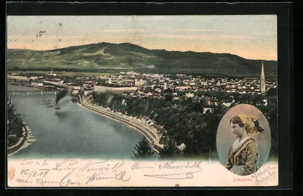 AK Linz a. d. Donau, Stadttotale, Linzerin im Trachtenkleid
