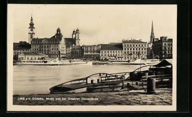 AK Linz a. d. Donau, Urfahrer Donaulände mit Dampfern