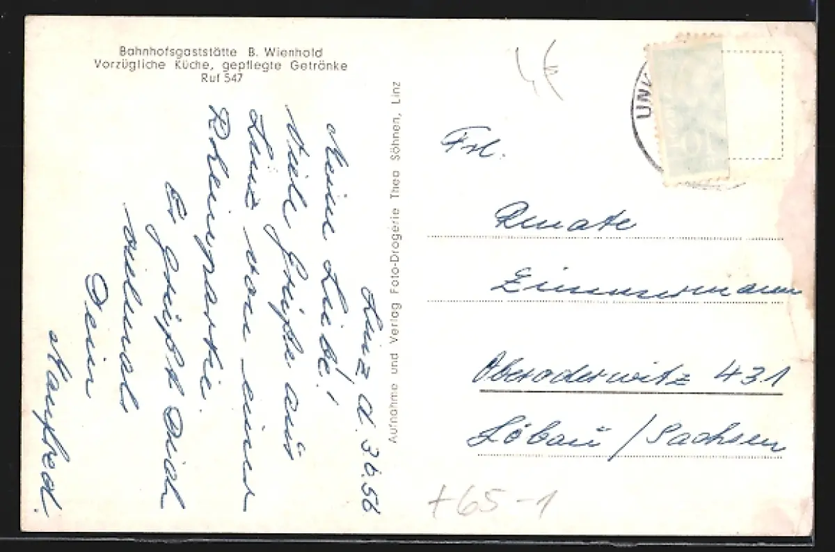 alte Ansichtskarte, gelaufen 1956, Briefmarke entfernt, Eckknicke re. oben u. li., minimaler Einriss li. mittig, guter Zustand