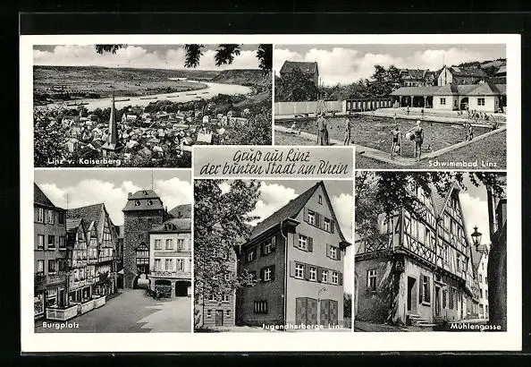 AK Linz am Rhein, Generalansicht v. Kaiserberg aus, auf dem Burgplatz, Jugendherberge, in der Mühlengasse