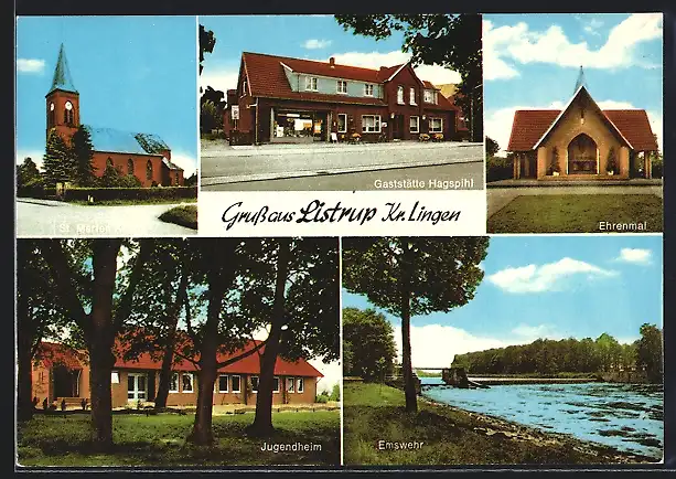 AK Listrup /Kr. Lingen, Gaststätte Hagspihl, Ehrenmal, Jugendheim