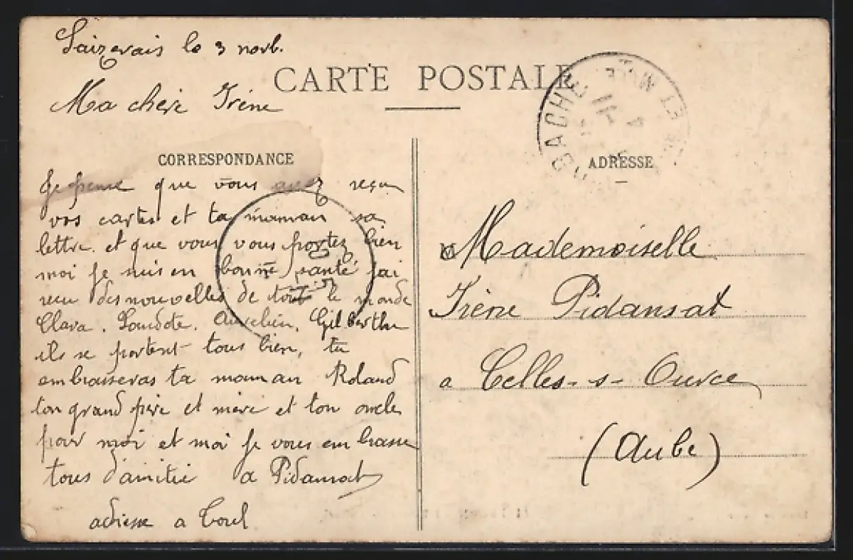 Personenbezogene Daten auf der Rückseite der Karte wurden durch blauen Textmarker unkenntlich gemacht. Die blauen Stellen sind auf die Vorderseite durchgeweicht und wirken sich negativ auf das Postkartenfoto aus