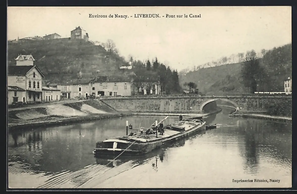 AK Liverdun /Nancy, Pont sur le Canal avec péniche naviguant tranquillement