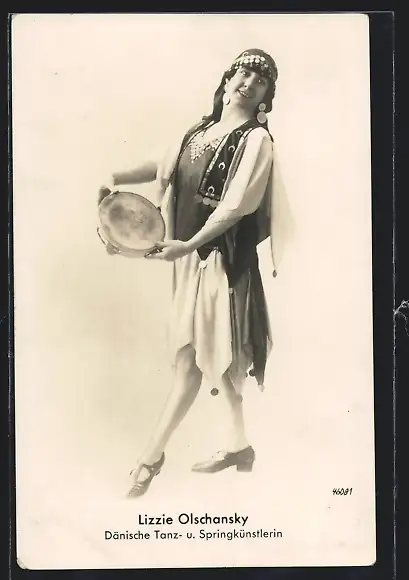 AK Lizzie Olschansky, Dänische Tanz- und Springkünstlerin mit einem Tamburin