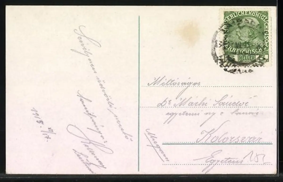Personenbezogene Daten auf der Rückseite der Karte wurden durch blauen Textmarker unkenntlich gemacht. Die blauen Stellen sind auf die Vorderseite durchgeweicht und wirken sich negativ auf das Postkartenfoto aus
