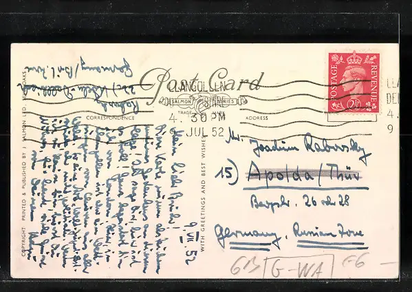Personenbezogene Daten auf der Rückseite der Karte wurden durch blauen Textmarker unkenntlich gemacht. Die blauen Stellen sind auf die Vorderseite durchgeweicht und wirken sich negativ auf das Postkartenfoto aus