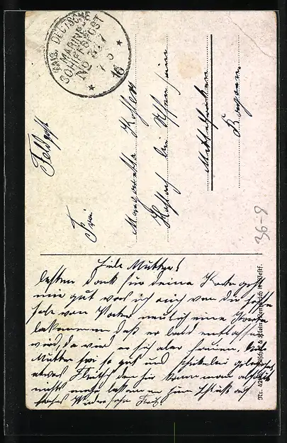 alte Ansichtskarte, gelaufen 1916, Eckknicke oben, Klebe- und Papierrest unten li., Stempelspur, guter Zustand