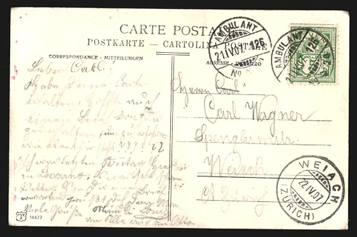 gelaufen 1907, Eckknicke li. unten u. re. oben, guter Zustand