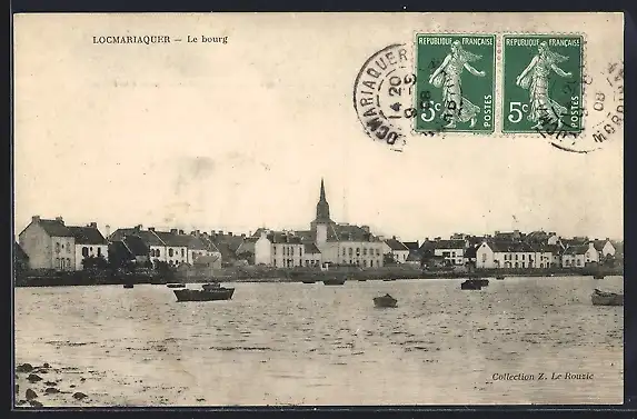 AK Locmariaquer, Le bourg et vue sur le port avec bateaux