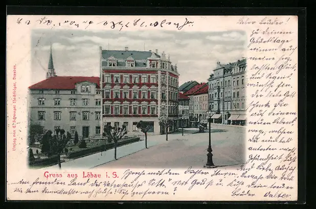 AK Löbau /Sa., Strassenpartie mit Anlagen und Kirchturmspitze