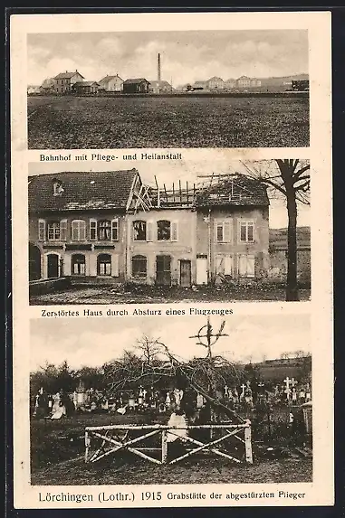 AK Lörchingen, Bhf. mit Pflege- und Heilanstalt, Haus durch Absturz eines Fliegers zerstört, Grabstätte der abg. Flieger
