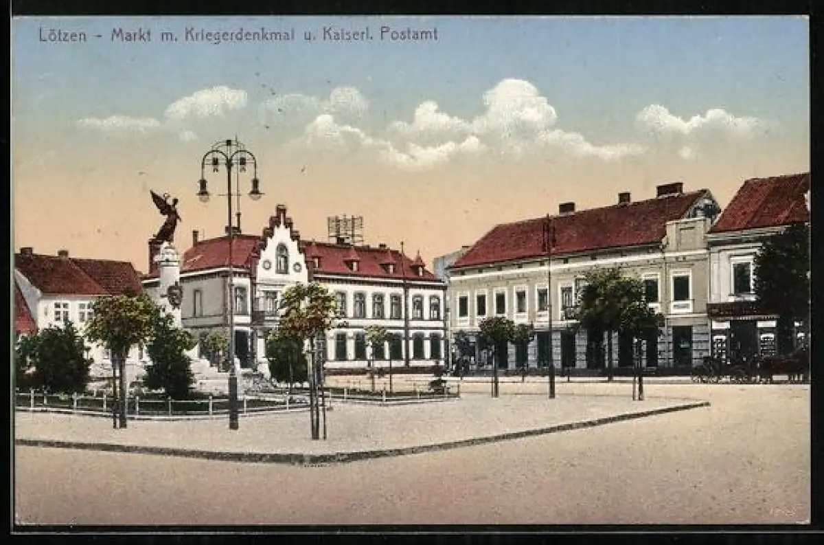 AK Lötzen, Markt mit Kriegerdenkmal u. Kaiserl. Postamt