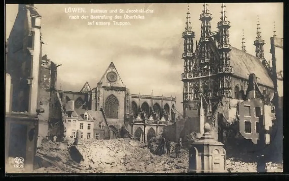 AK Löwen, Rathaus und St. Jacobskirche nach der Bestrafung des Überfalls auf unsere Truppen