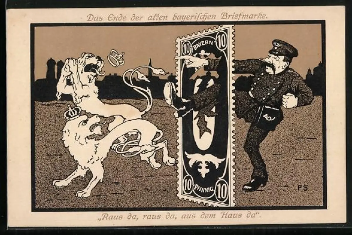 AK Löwen des bayerischen Wappens werden von Briefträger vertrieben