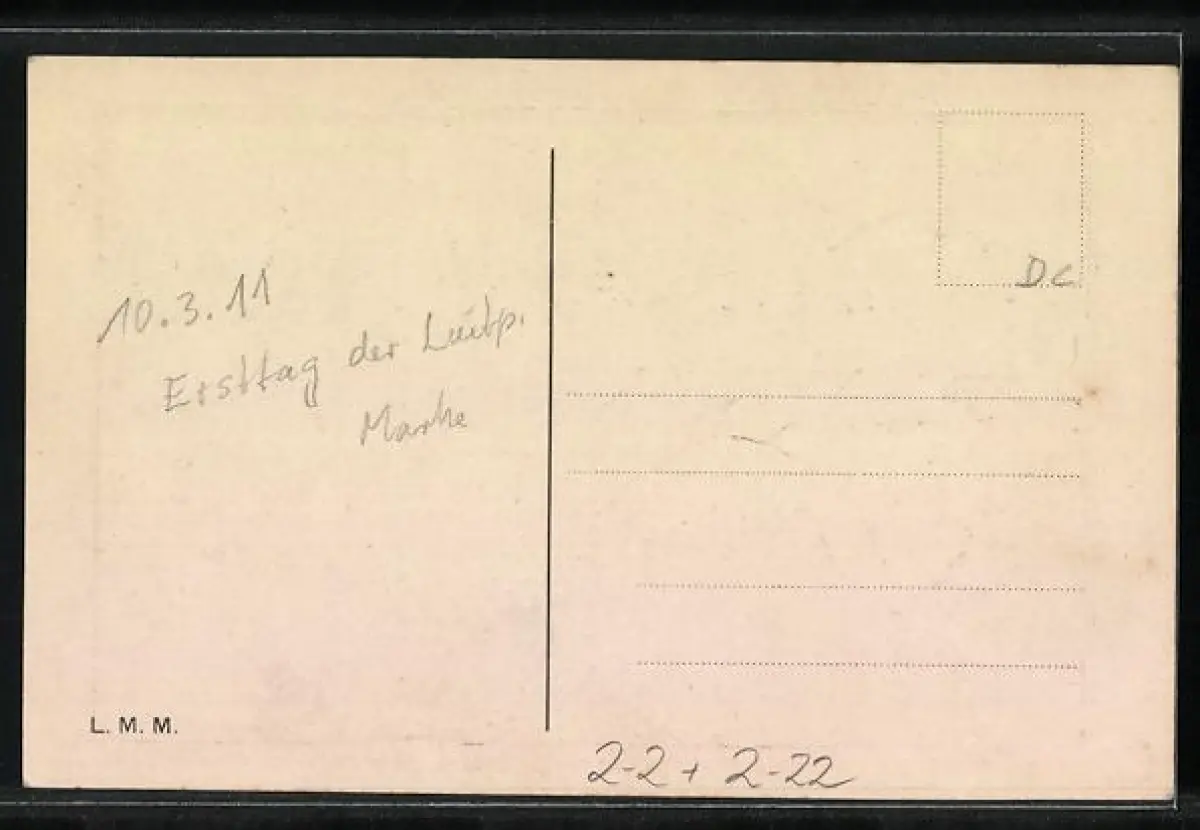 Personenbezogene Daten auf der Rückseite der Karte wurden durch blauen Textmarker unkenntlich gemacht. Die blauen Stellen sind auf die Vorderseite durchgeweicht und wirken sich negativ auf das Postkartenfoto aus