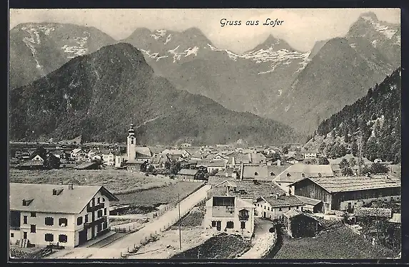 AK Lofer, Teilansicht mit Kirche und Strassenpartie